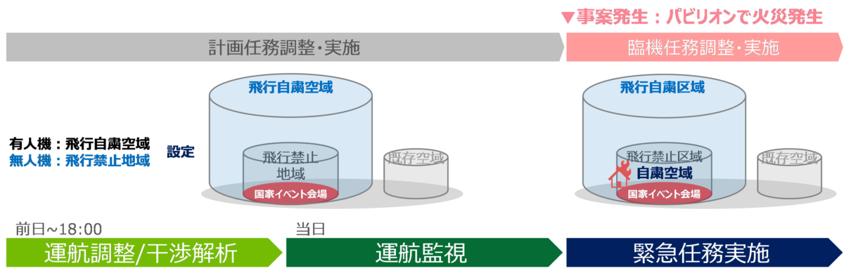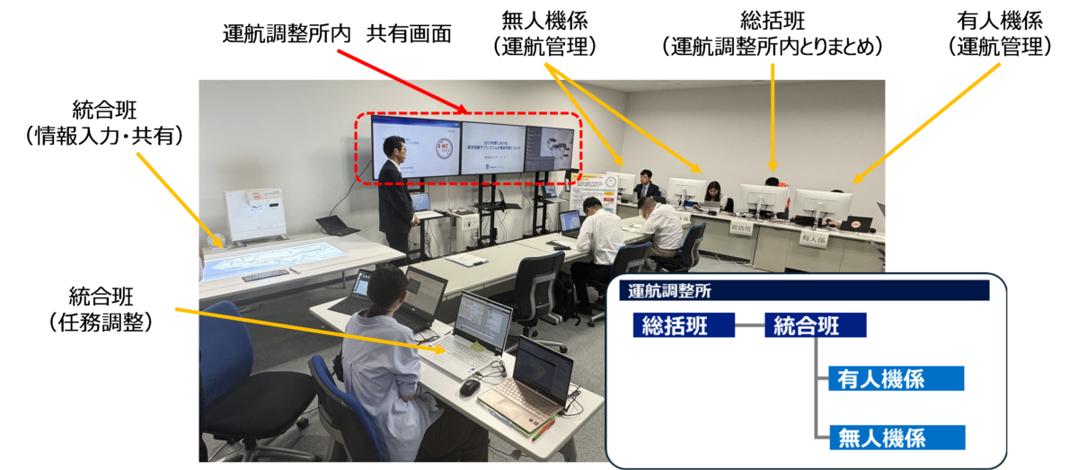 「運航調整所」では、有人機・無人機が飛行する前日の調整から、飛行当日の運航監視、当日に発生した緊急任務を有人機・無人機に割り当てる対応(任務割当)までを一連の流れとして想定し、これらの業務を対象とした実証シナリオを設定しました。(図1、図2)