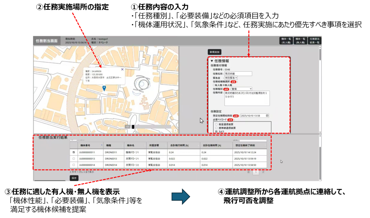 - 割り当てられた任務を、無人機を飛行させるオペレータに連携