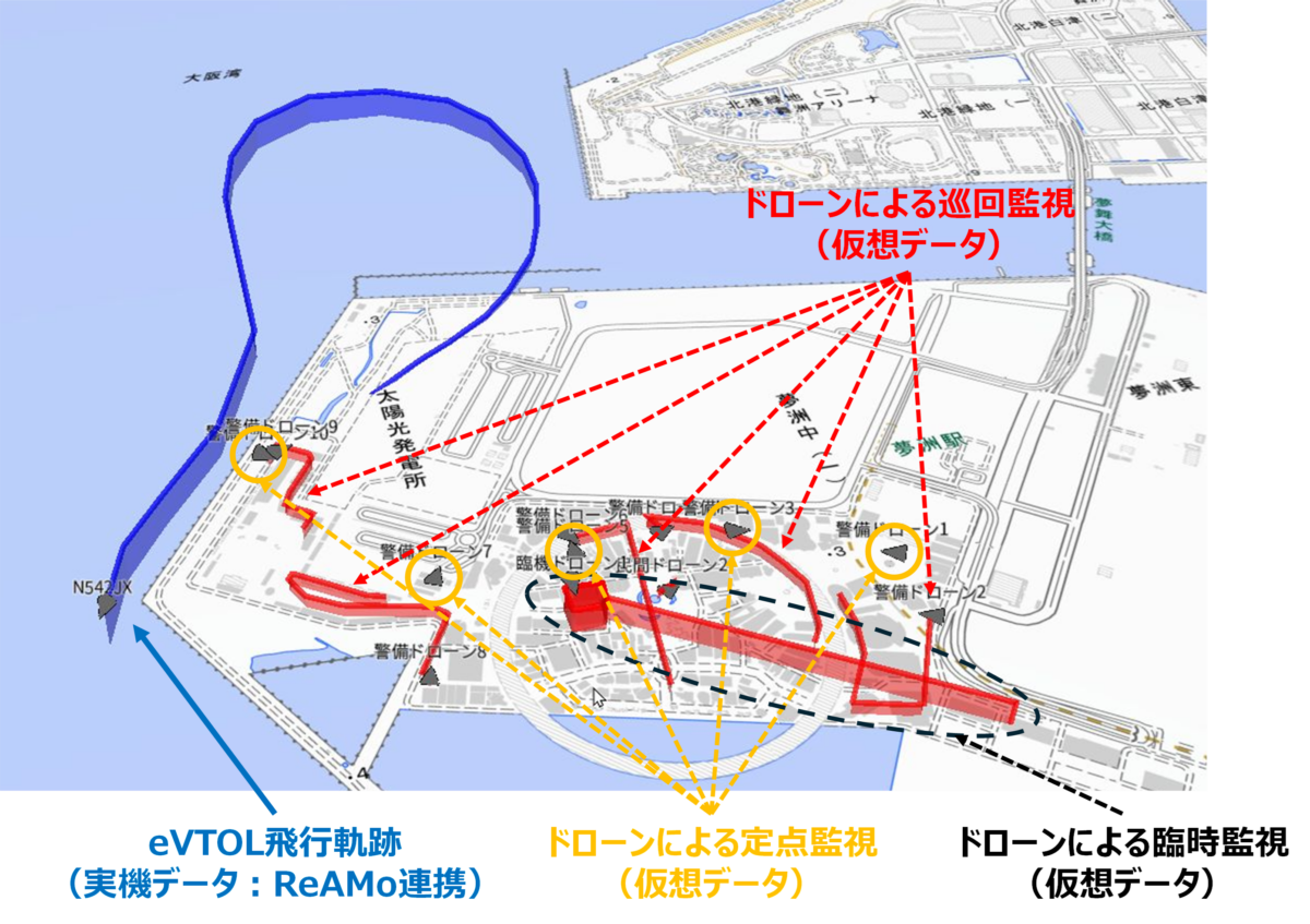 本実証において、警備活動中に臨時に発生した緊急任務への対応は、実機への影響を考慮して仮想データを使用しました(図3)。また、次世代エアモビリティの社会実装に向けた実現プロジェクトである「ReAMoプロジェクト(※4)」と連携し、同万博で飛行した空飛ぶクルマ(eVTOL)の運航情報も共有できる体制を構築しました。(図4)